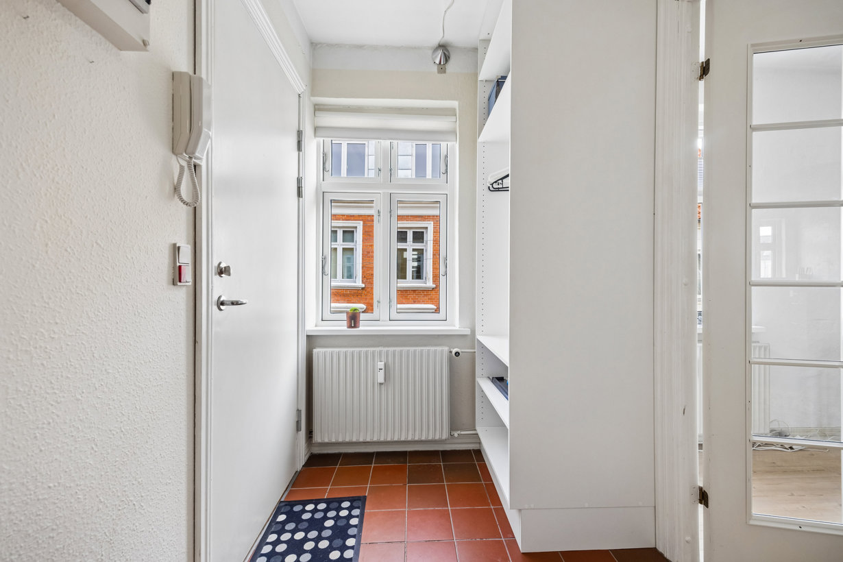 Lejligheden er beliggende på 2. sal og fremstår lys, velindrettet og 100% indflytningsklar. Du bydes velkommen i en flot entré med indbygget garderobeskab og adgang til et nyere badeværelse med klinker, separat bruseniche og stilfulde messingdetaljer.