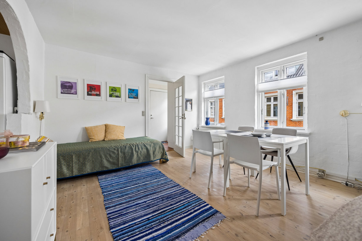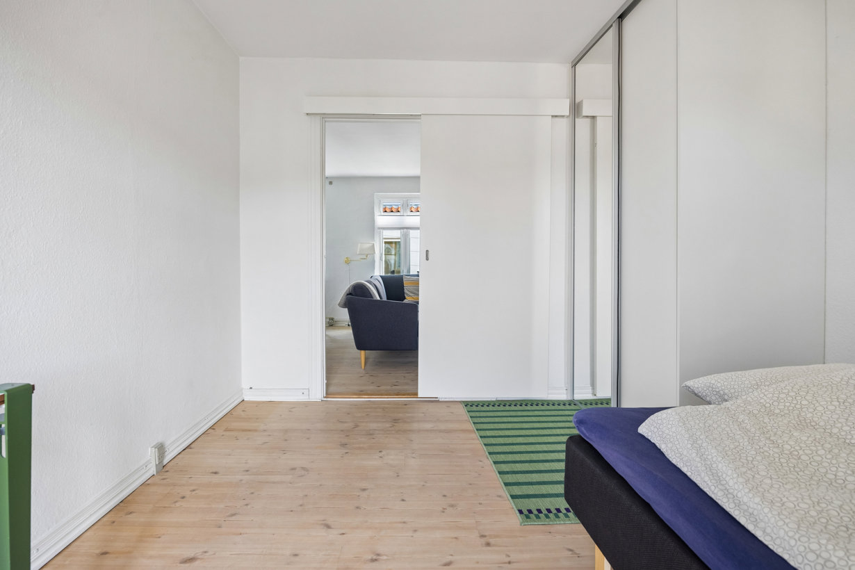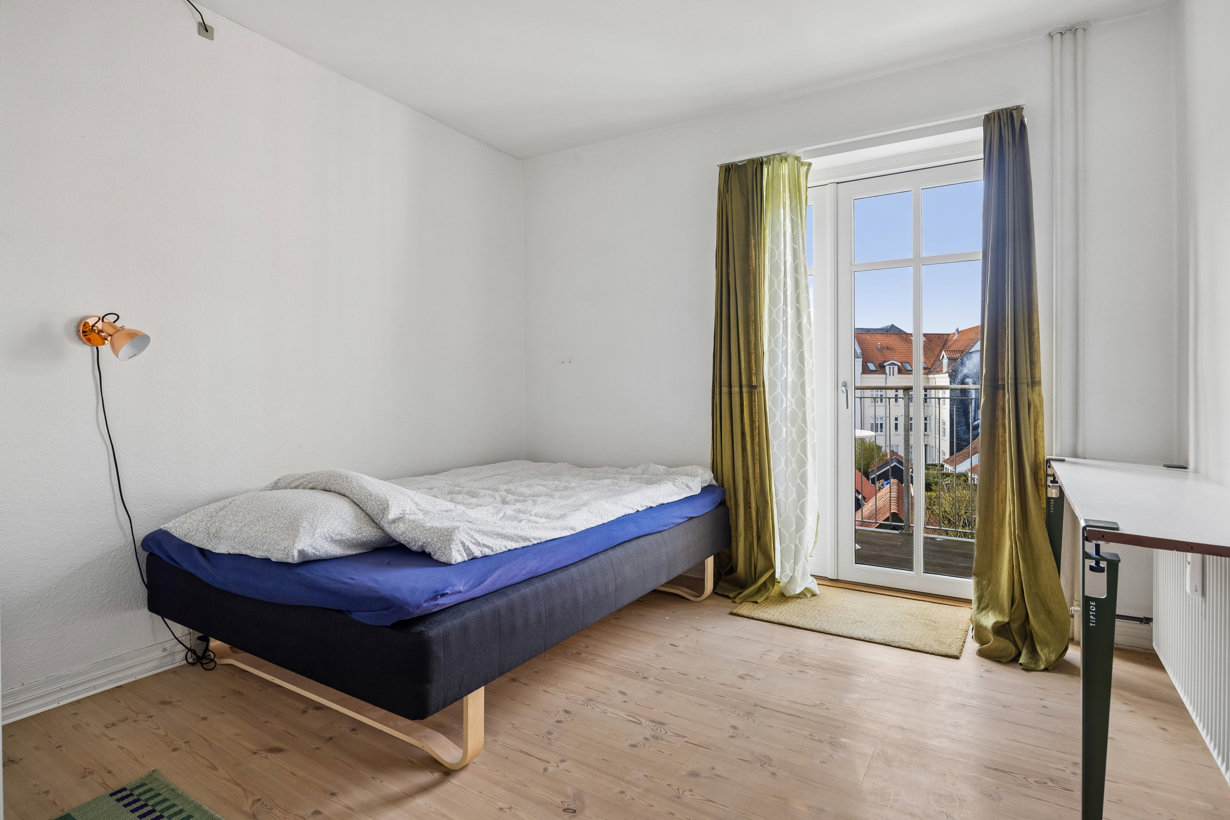 Soveværelset er lyst og rummeligt med plads til dobbeltseng og opbevarting. Herfra er der udgang til en skøn sydvendt altan, hvor du kan nyde solen det meste af dagen samt udsigten til den stemningsfulde gård og et af Aalborgs populære gavlmalerier. Lejligheden er yderligere opgraderet med nye 3-lags termovinduer fra 2021.