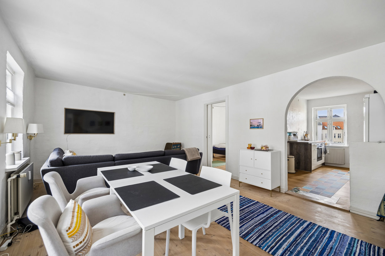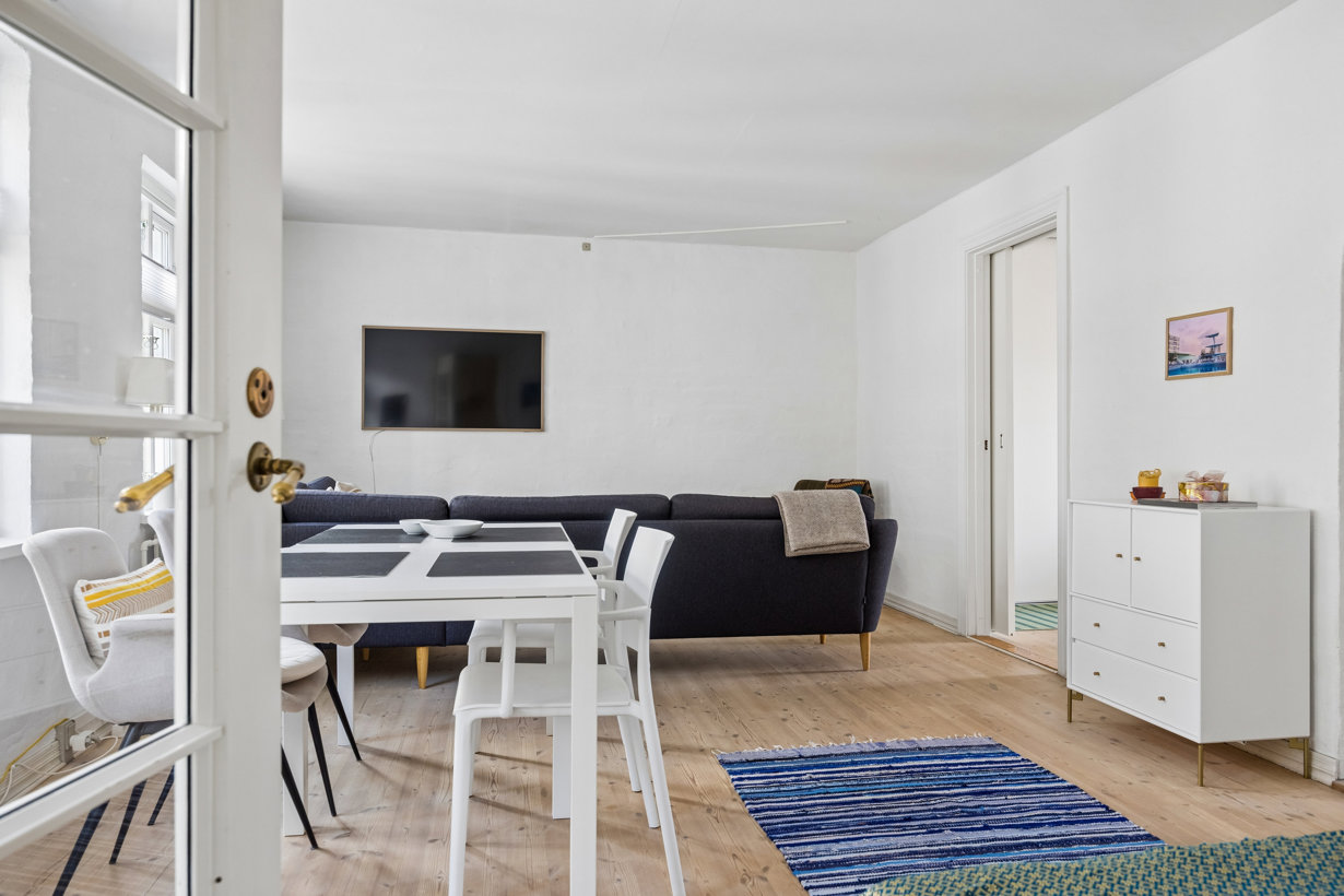 Boligens stue er rummelig og indbydende med flotte plankegulve og god plads til både sofaområde og spiseplads. I åben forbindelse ligger det moderne køkken i et tidløst design med både opvaskemaskine og vaskemaskine.